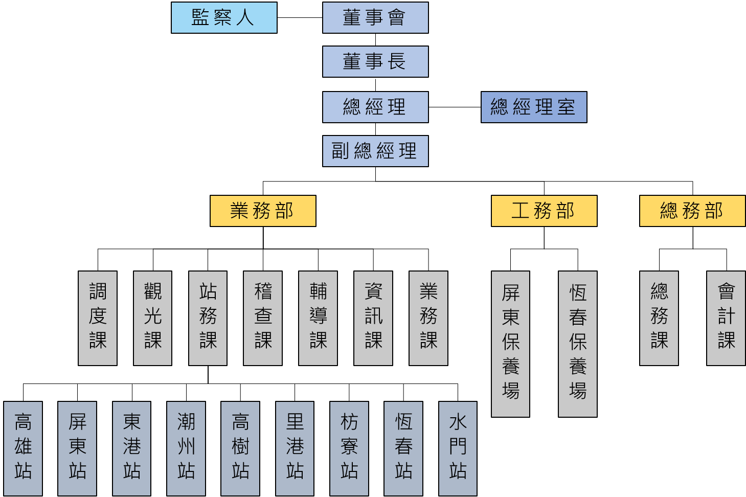 本公司管理部門(mén)設(shè)置業(yè)務(wù)、工務(wù)、總務(wù)三部,以下分9課辦理各項(xiàng)行政業(yè)務(wù),營(yíng)運(yùn)區(qū)域設(shè)置車(chē)站9處,兼轄保養(yǎng)場(chǎng)2處,